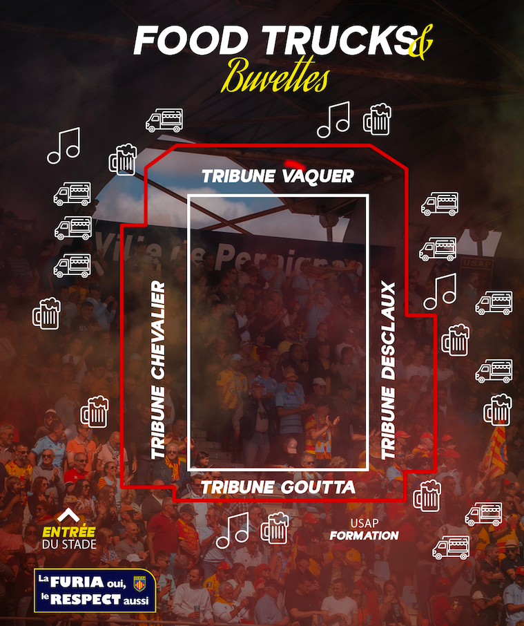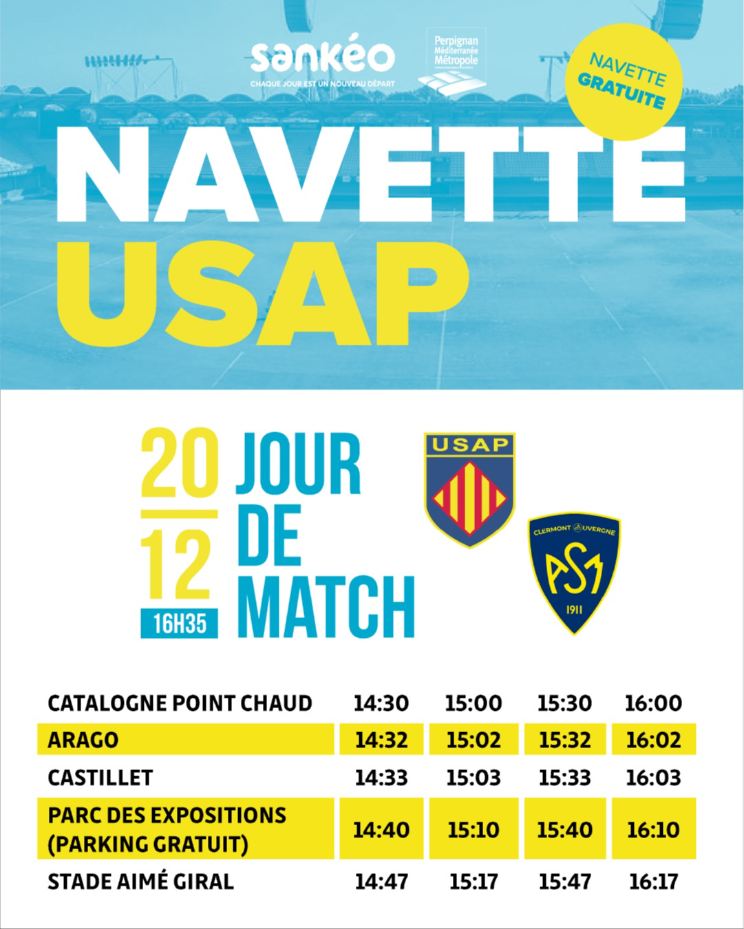 Pour vous rendre au stade, empruntez la Navette USAP. La Navette USAP est une navette gratuite sur présentation de la place du match ou de la carte d'abonnement USAP. Elle dessert le centre-ville de Perpignan et le parking du Parc des Expositions. Avant le match, le 1er départ se réalise 2h avant le coup d'envoi et le dernier départ 30 min avant le coup d'envoi. Après le match, le départ se réalise 30 mn après le coup de sifflet final. Plus d'informations sur www.sankeo.com/lignes-horaires-plans